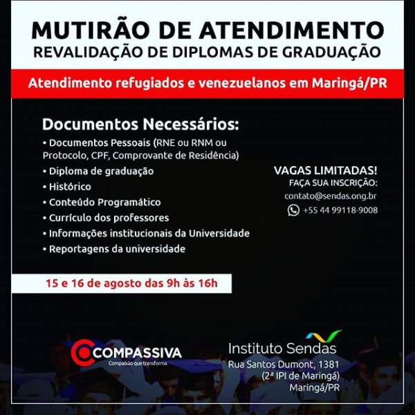 Refugiados que vivem no Brasil têm escolaridade acima da média brasileira. Levantamento da Agência da ONU para Refugiados (Acnur) apontou que 34% dos 487 refugiados ouvidos pelo estudo concluíram Ensino Superior e 3% cursaram pós-graduação, especialização, mestrado ou doutorado. No entanto, poucos conseguem revalidar o diploma no país. Para auxiliar no processo de revalidação do diploma de Ensino Superior de refugiados e venezuelanos que vivem em Maringá, o Instituto Sendas vai fechar uma parceria com a ONG Compassiva, de São Paulo. A ONG é parceira da Acnur e desde o início do projeto, em 2016, viabilizou a revalidação de 34 certificados em todo o Brasil. Outros 132 estão em análise.